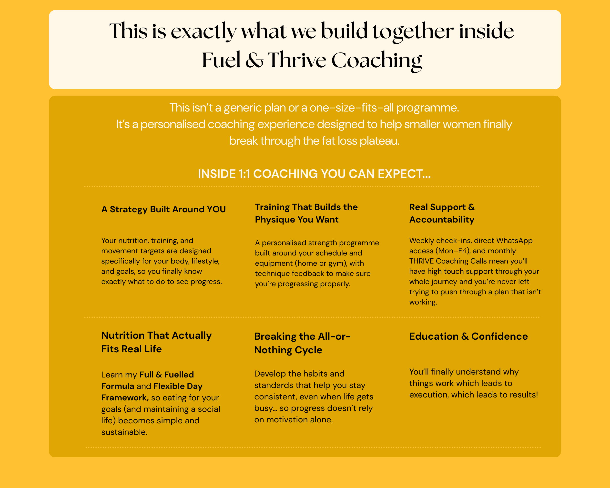 When you join coaching, you’ll receive everything you need to finally break the fat loss cycle and build sustainable results.